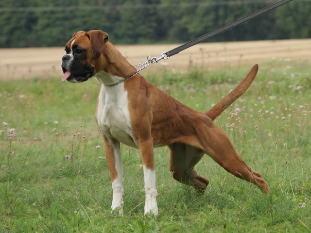Groß, leuchtend rotgelb mit gut platzierten weißen Abzeichen. Ausdrucksvoller Kopf, schlanker Ober Kopf, kräftiger Fang, etwas kurz im Nasenrücken, dunkle Augen, fast breiter Zahnstand. Elegantes, dennoch substanzvolles Gebäude, quadratisches, trocken aufgebaut, tadellose Front, kraftvolle, korrekt im Winkel stehende Hinterhand, äußerst lebhaft in der Präsentation. Fehlerfrei in der Bewegung. (Richter: Roland Bebber)